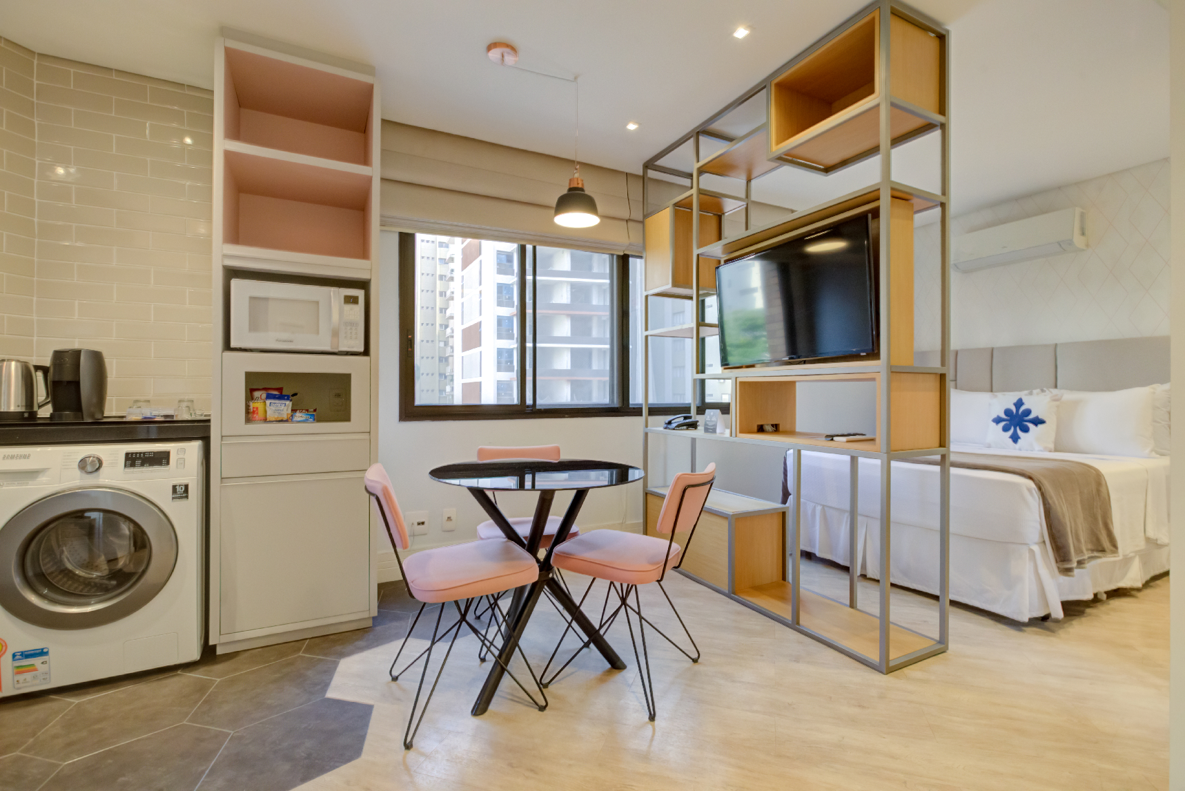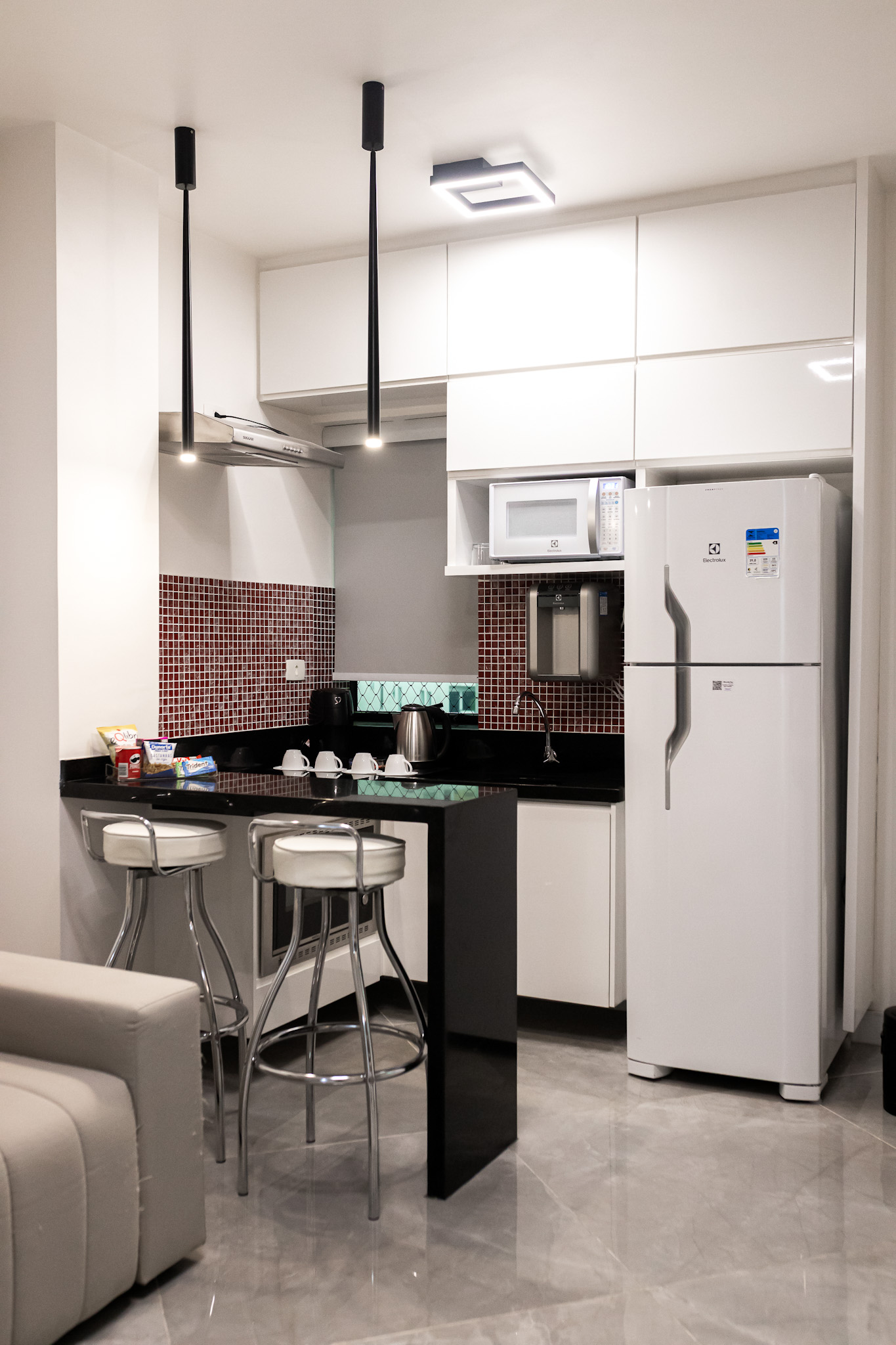 Quarto amplo de 32 m² e dispõe de uma cama de casal, wifi, ar condicionado, tv a cabo, geladeira, micro-ondas, telefone, cafeteira, chaleira, sofá, guarda-roupa, mesa, banheiro com box de vidro, enxoval diferenciado, amenities diferenciados e café da manhã cortesia servido no restaurante.