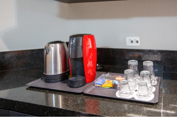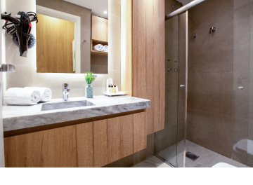 Quarto amplo de 32 m² e dispõe de duas camas de solteiro, wifi, ar condicionado, tv a cabo, geladeira, micro-ondas, telefone, cafeteira, chaleira, sofá, guarda-roupa, mesa, banheiro com box de vidro, enxoval diferenciado, amenities diferenciados e café da manhã cortesia servido no restaurante.